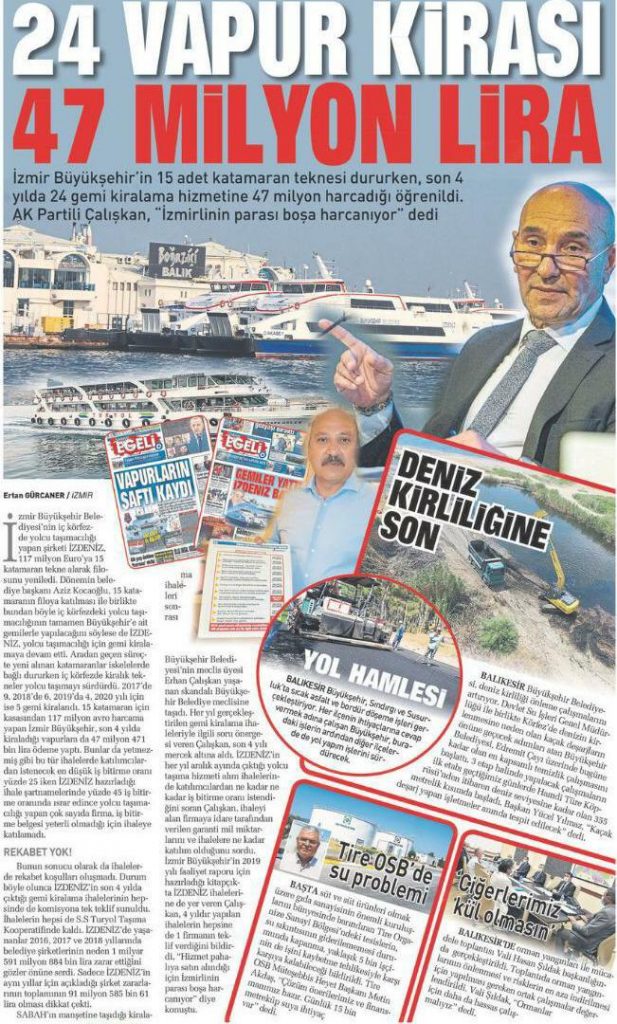İzmir Büyükşehir’in 15 adet katamaran teknesi dururken, son 4 yılda 24 gemi kiralama hizmetine 47 milyon harcadığı öğrenildi. AK Partili Çalışkan, “İzmirlinin parası boşa harcanıyor” dedi.