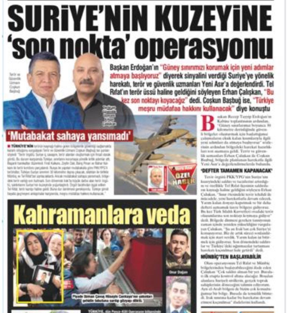 Başkan Recep Tayyip Erdoğan’ın Kabine toplantısının ardından, “Güney sınırlarımız boyunca 30 kilometre derinliğinde güvenli bölgeler oluşturmak için başlattığımız çalışmaların eksik kalan kısımlarıyla ilgili yeni adımları da atmaya başlıyoruz” sözlerinin ardından bölgedeki harekat hazırlıkları son aşamaya geldi. Terör ve güvenlik uzmanları Erhan Çalışkan ile Coşkun Başbuğ, bölgede planlanan harekatla ilgili Yeni Asır’a değerlendirmelerde bulundu.