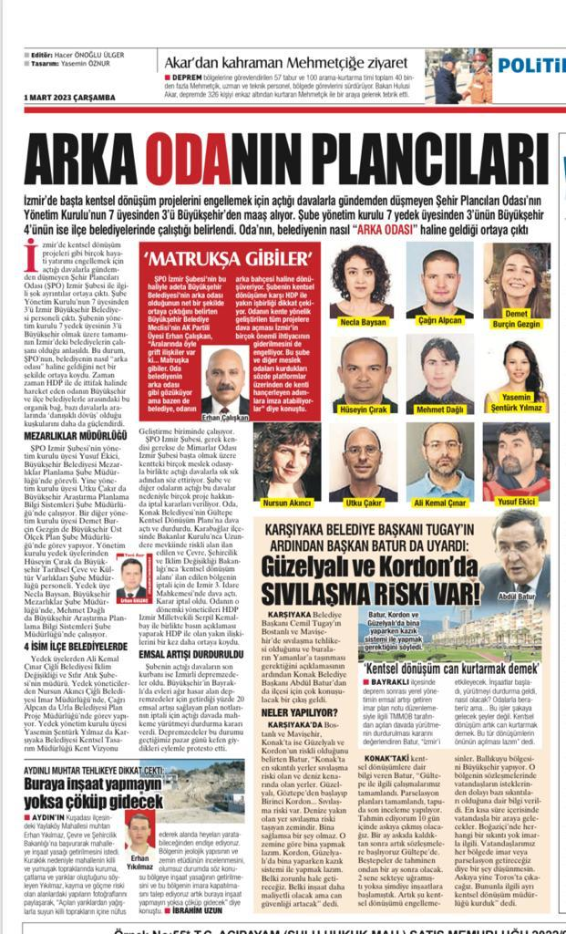 İzmir’de kentsel dönüşüm projeleri gibi birçok hayati yatırımı engellemek için açtığı davalarla gündemden düşmeyen Şehir Plancıları Odası (ŞPO) İzmir Şubesi ile ilgili şok ayrıntılar ortaya çıktı. Şube Yönetim Kurulu’nun 7 üyesinden 3’ü İzmir Büyükşehir Belediyesi personeli çıktı. Şubenin yönetim kurulu 7 yedek üyesinin 3’ü Büyükşehir olmak üzere tamamının İzmir’deki belediyelerin çalışanı olduğu anlaşıldı. Bu durum, ŞPO’nun, belediyenin nasıl “arka odası” haline geldiğini net bir şekilde ortaya koydu. Zaman zaman HDP ile de ittifak halinde hareket eden odanın Büyükşehir ve ilçe belediyelerle arasındaki bu organik bağ, bazı davalarla aralarında ‘danışıklı dövüş’ olduğu kuşkularını daha da güçlendirdi.