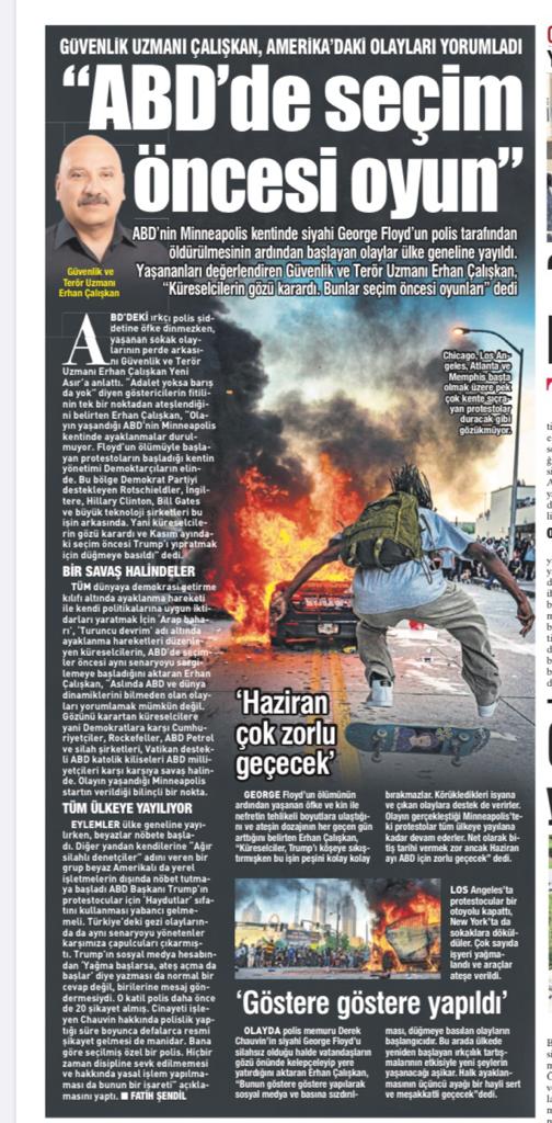 dünyaya demokrasi getirme kılıfı altında ayaklanma hareketi ile kendi politikalarına uygun iktidarları yaratmak İçin ‘Arap baharı’, ‘Turuncu devrim’ adı altında ayaklanma hareketleri düzenleyen küreselcilerin, ABD’de seçimler öncesi aynı senaryoyu sergilemeye başladığını aktaran Erhan Çalışkan, “Aslında ABD ve dünya dinamiklerini bilmeden olan olayları yorumlamak mümkün değil. Gözünü karartan küreselcilere yani Demokratlara karşı Cumhuriyetçiler, Rockefeller, ABD Petrol ve silah şirketleri, Vatikan destekli ABD katolik kiliseleri ABD milliyetçileri karşı karşıya savaş halinde. Olayın yaşandığı Minneapolis startın verildiği bilinçli bir nokta.